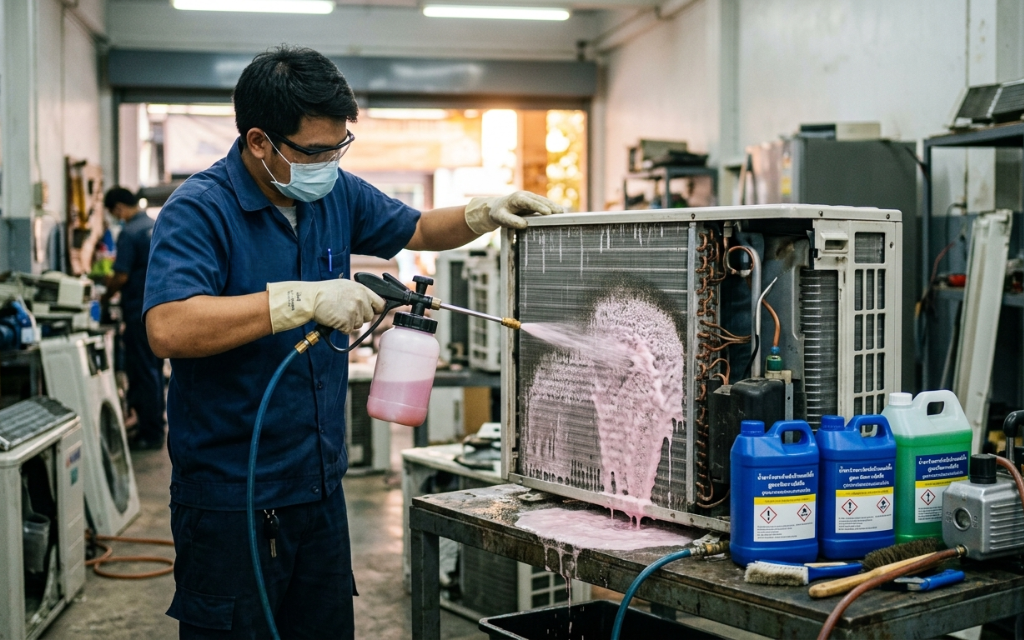 - ตัวช่วยช่างมือโปร: แนะนำให้ใช้ “น้ำยาล้างคอยล์แอร์” ที่มีคุณภาพ (เลือกซื้อได้ที่ศรีกรุงเครื่องเย็น) น้ำยาจะช่วยสลายคราบสกปรก คราบหินปูน และเขม่าควันได้หมดจด โดยไม่ทำลายเคลือบผิวบลูฟิน (Blue Fin) หรือโกลด์ฟิน (Gold Fin) ของแอร์
