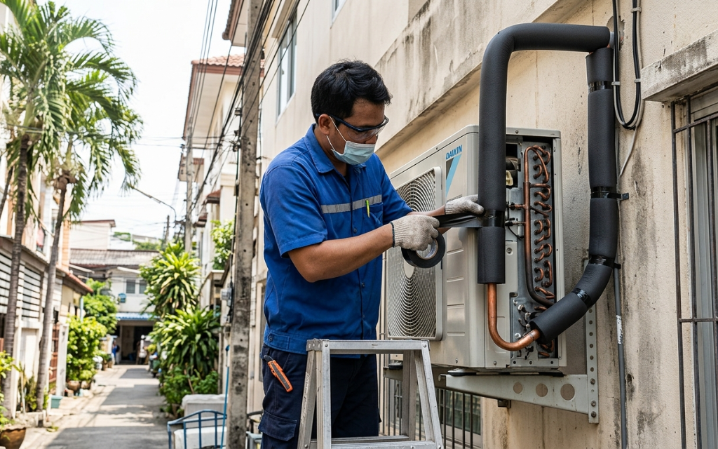 - คำแนะนำ: ตรวจสอบฉนวนทุกๆ 1-2 ปี หากพบว่าเปื่อยให้รีบพันเทปพันท่อใหม่ หรือเปลี่ยนฉนวนใหม่ทันที เพื่อรักษาอุณหภูมิน้ำยาให้เย็นจัดจนถึงในห้อง