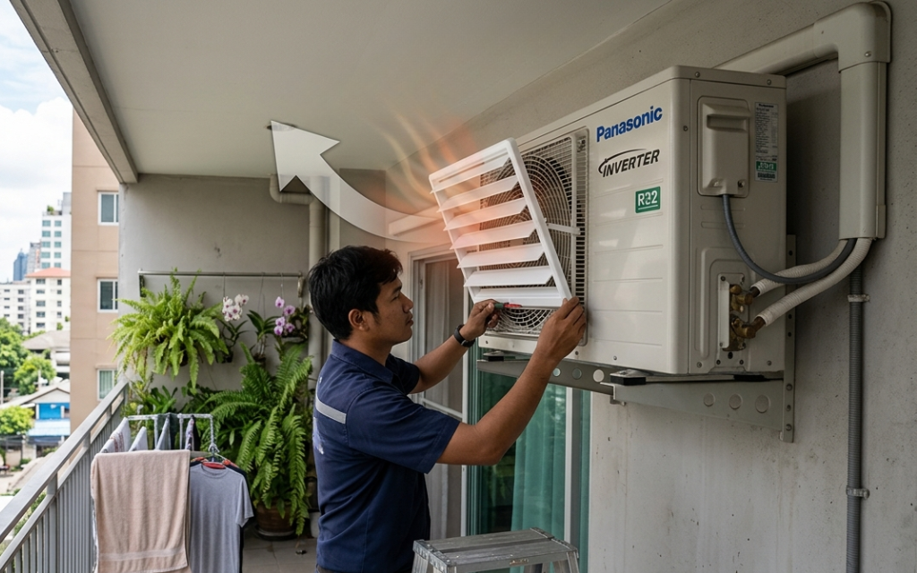 - ข้อควรระวัง: ห้ามวางกระถางต้นไม้ ตากผ้า หรือวางสิ่งของขวางทางลมเด็ดขาด เพราะจะทำให้เครื่อง “โอเวอร์ฮีท” และตัดการทำงานบ่อยครั้ง